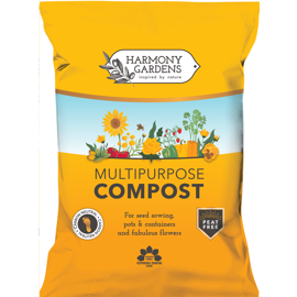 Peat-free and Carbon Neutral compost. Based on a mix of coir, composted bark, recycled wood-fibre and green compost with added nutrients. Harmony Gardens Multipurpose Compost is the perfect potting compost, creating the ideal rooting and growing conditions for all plants growing in containers.