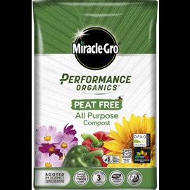 Miracle-Gro® Performance Organics Peat Free All Purpose Compost is a peat-free compost ideal for plants, flowers, fruits and vegetables. Perfect for use in beds, borders, hanging baskets, pots and containers. Glorious on plants, gentle on nature! Peat-free compost can be used for all plants, flowers, fruits and vegetables. Not suitable for acid loving, ericaceous plants such as azaleas, rhododendrons and camellias.