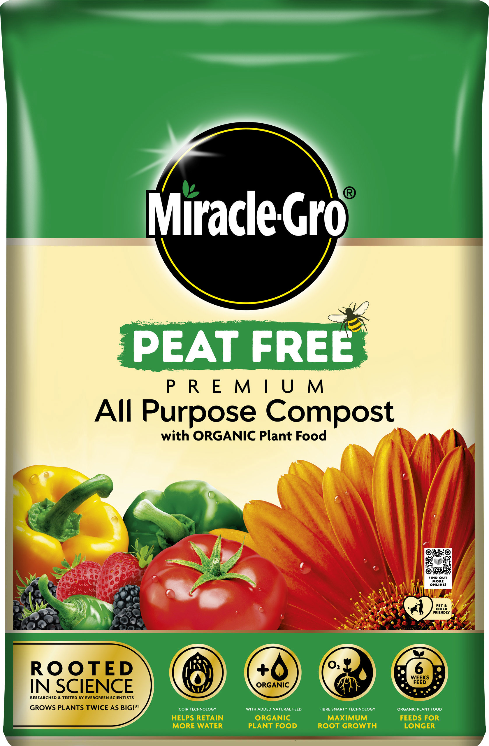 Miracle-Gro® Performance Organics Peat Free All Purpose Compost is a peat-free compost ideal for plants, flowers, fruits and vegetables. Perfect for use in beds, borders, hanging baskets, pots and containers. Glorious on plants, gentle on nature! Peat-free compost can be used for all plants, flowers, fruits and vegetables. Not suitable for acid loving, ericaceous plants such as azaleas, rhododendrons and camellias.