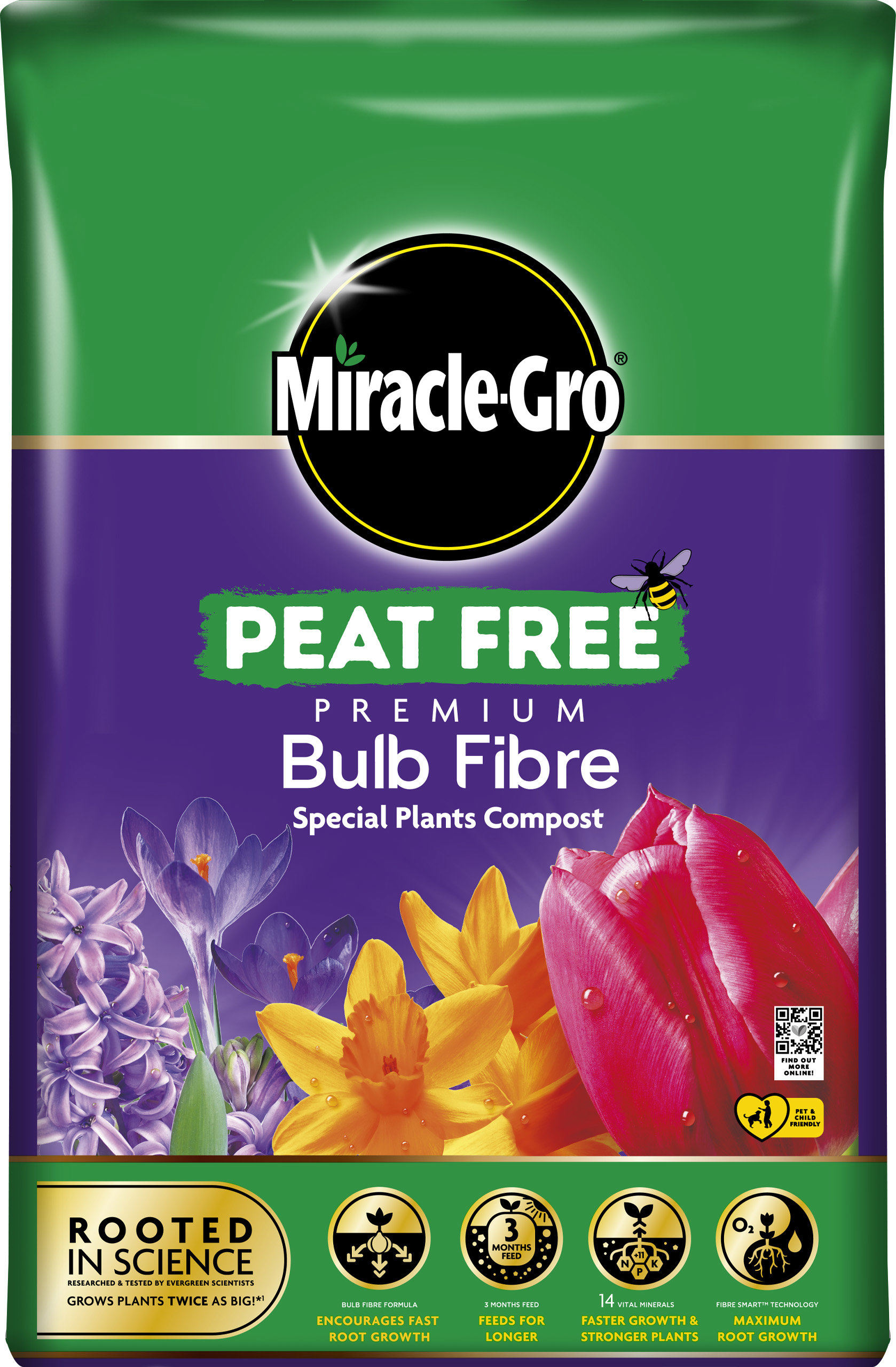 Miracle-Gro® Peat Free Premium Bulb Fibre is specially formulated to cater the needs for all bulb plants such as tulips, daffodils, hyacinths, crocuses and more. Containing patented Smart Fibre Technology and all the nutrients your plants need, Miracle-Gro Peat Free Bulb Fibre encourages fast root growth and helps bulbs replenish themselves and thrive again next season. Ideal for all bulbs such us tulips, daffodils, hyacinths and crocus. Perfect for use in indoors and outside.