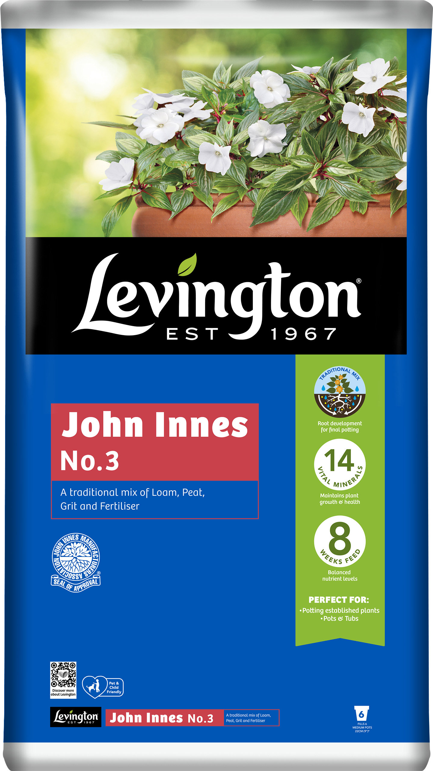 Approved by the John Innes Institute, Levington John Innes No.3 is ideal for final potting of plants. It has been specially developed, with a unique combination of 14 vital minerals for maintaining plants growth and health. Perfect for final potting of mature plants.